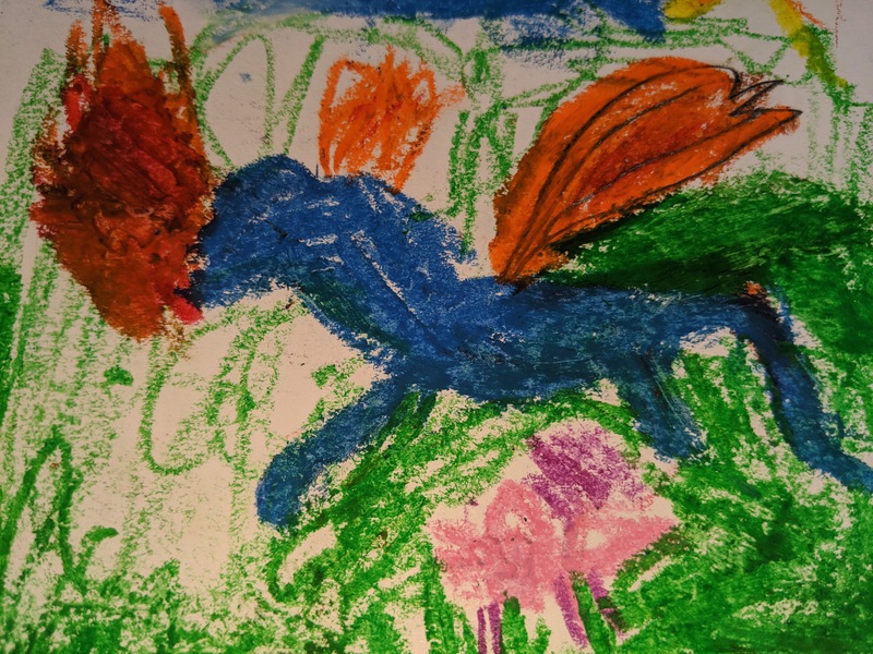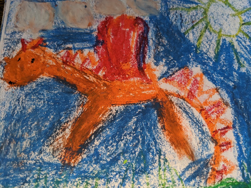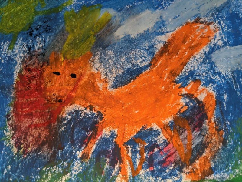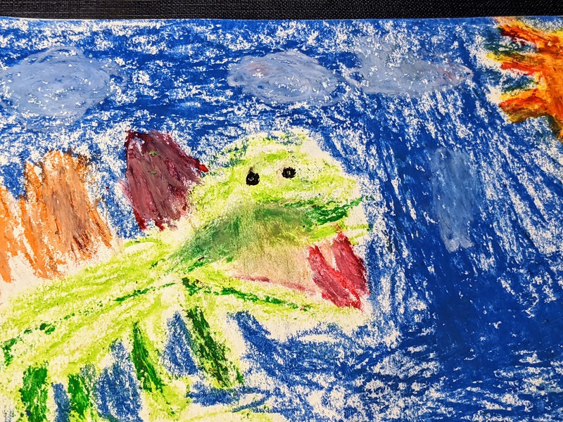 Students used a block drawing method where they started with a single shape and grew their ideas from that center shape. They did not pre-draw these. Students then created blended backgrounds. Students often chose to create contrast using warm and cool colors. They used their hearts and imaginations to create a bit of visual magic! They referenced Marc Chagall, Vincent van Gogh, Henri Rousseau. And if you are surprised to see a lot of chickens in the young artists' works, just know that Marc Chagall loved chickens too.