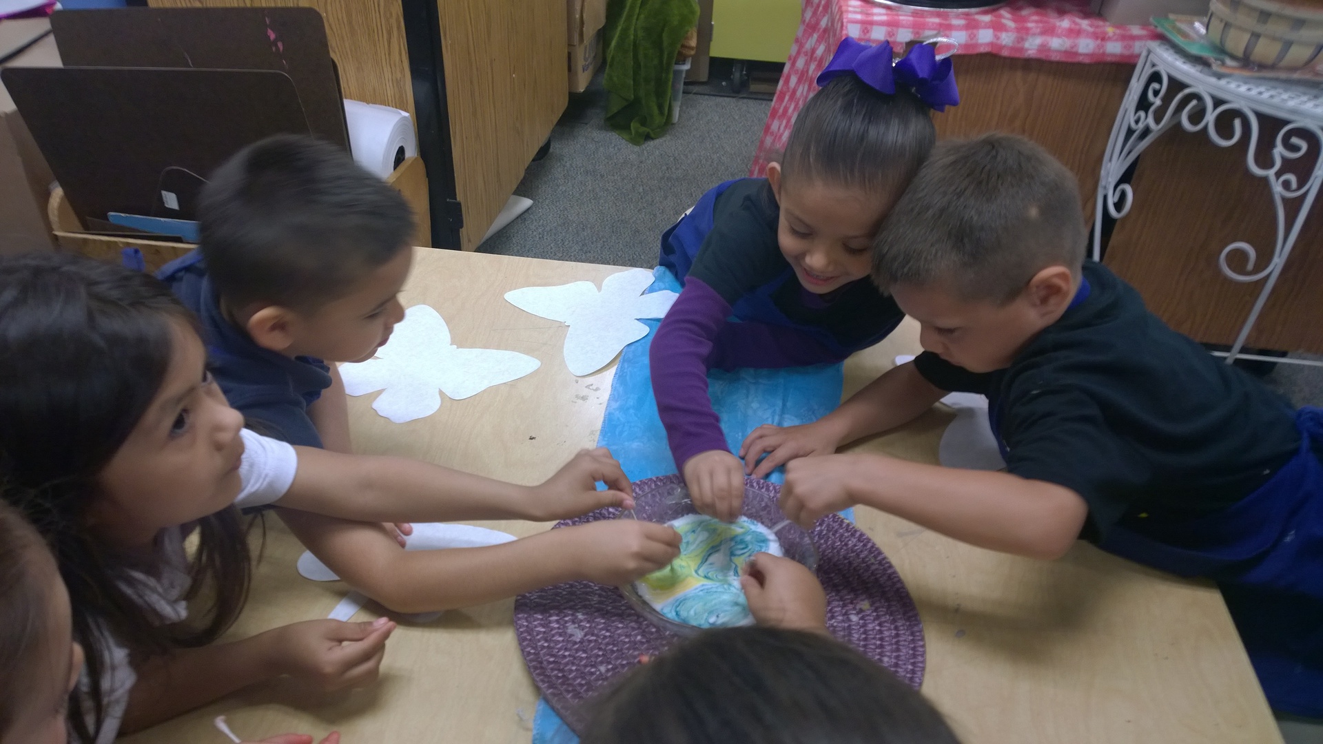 While students are on carcpet revisiting rain stories or at tables drawing selfportraits, small groups come to the table where we create our milk paint and paper prints. We use descriptive words for colors, actions, and sounds of rain as we quietly work.
