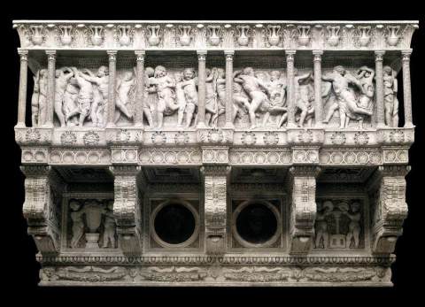 In 1431 the Opera del Duomo commissioned Luca della Robbia to erect a large marble Cantoria (singers' gallery) over the entrance to the north Sacristy in the Cathedral. Two years after Luca della Robbia began his work, Donatello was commissioned to design another Cantoria to be placed over the south Sacristy where it could form a counterpart to the one made by Robbia. Both were completed in 1439. On the occasion of the marriage of Ferdinando de' Medici in 1688 the two structures were found to be too small to accomodate all the singers, and they were replaced by wooden balconies. Later stone ones were substituted and are still in place today. Not until 1891 were the two cantorie reassembled in the museum, after having been kept dismantled at the Bargello.